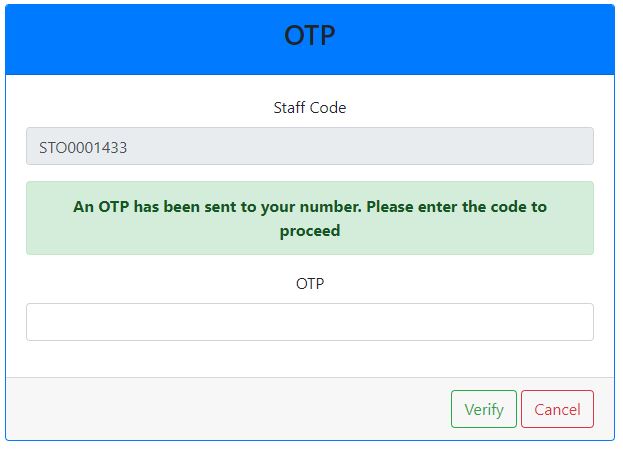 Enter the OTP code sent to the mobile number to verify the staff.